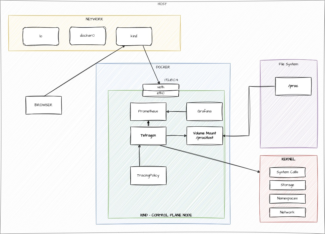 Tetragon can hook into the kernel using kprobes and tracepoints, as well as in user-space programs using uprobes.