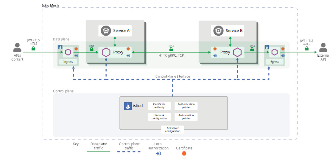 The Istio security features provide strong identity, powerful policy, transparent TLS encryption, and authentication, authorization and audit (AAA) tools to protect your services and data.
